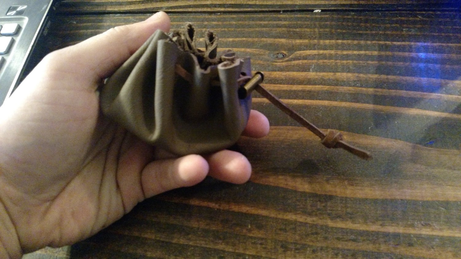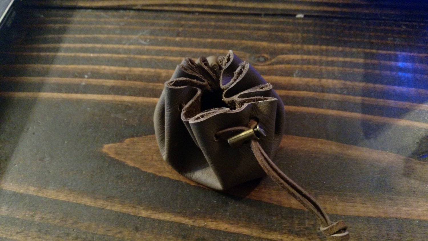 This is a small leather pouch with leather lace and a metal clasp. It's made from dark genuine italian leather, and was cut and assembled by me here in Baltimore