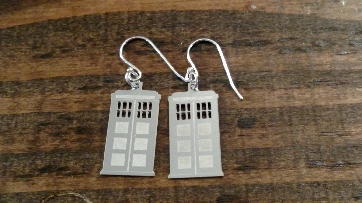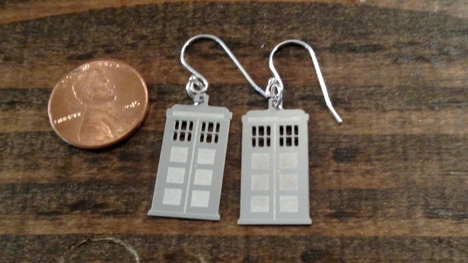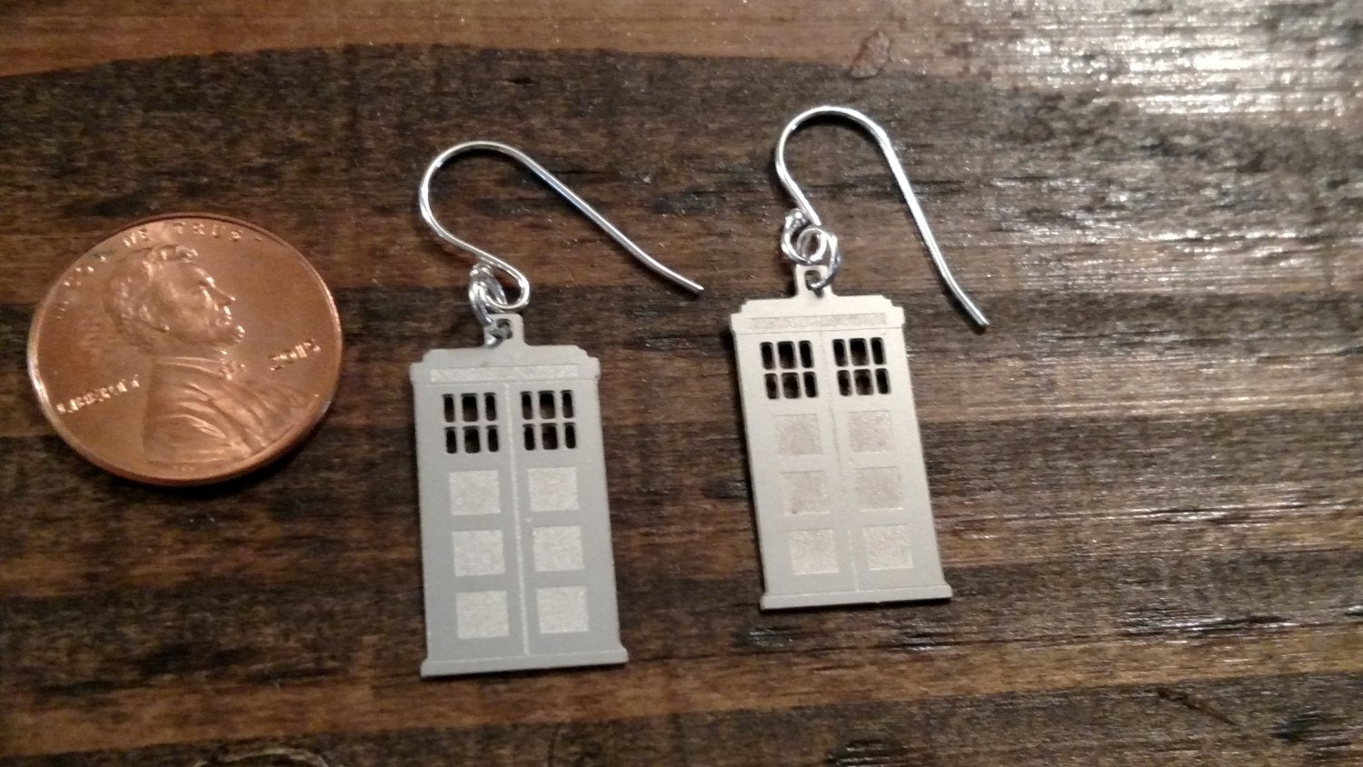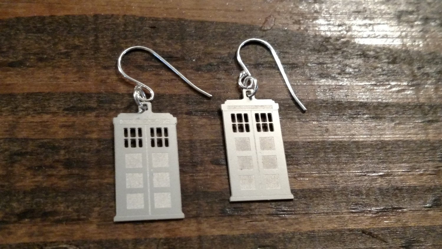 These stainless steel TARDIS earrings come with sterling silver earring hooks and are about 1" tall. The six tiny windows are cut out all the way through the metal!